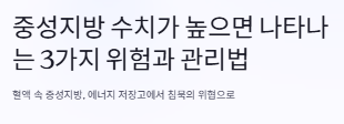 - 대사증후군: 고혈압, 당뇨, 고지혈증이 한꺼번에 찾아오는 대사증후군의 핵심 진단 기준이 바로 중성지방 수치입니다.